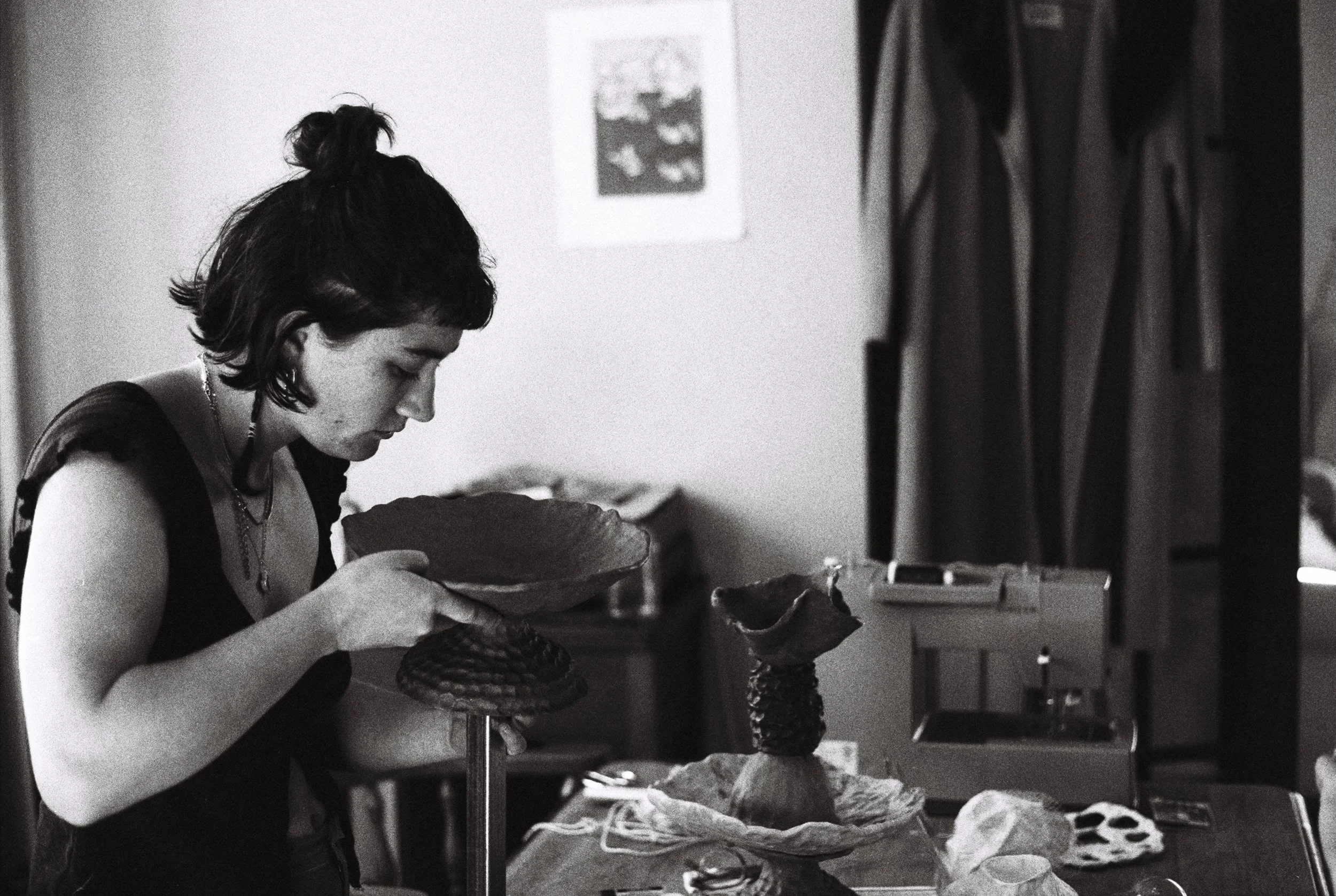 I am a multimedia artist and gardener, working primarily with ceramics and textiles. I was born in Santa Cruz, CA, and moved to Portland, ME, after receiving a BA in Human Ecology from the College of the Atlantic. Since moving to Maine, I’ve developed a love for color, especially during the cold, dark months. My work often takes the form of familiar domestic objects, like lamps, vases, and quilts, reimagined with vibrant colors, unexpected forms, and personal items.